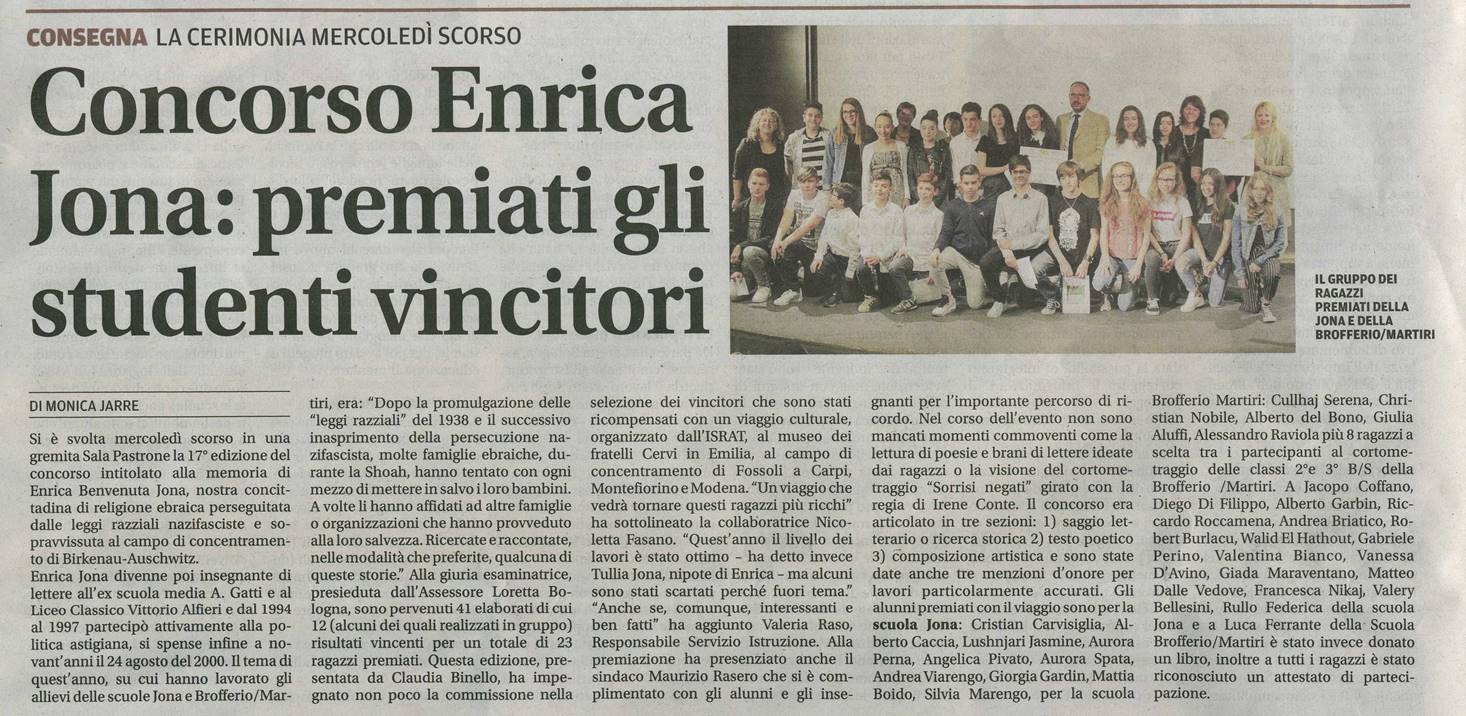 La premiazione del concorso giunto alla 17^ edizione è avvenuta mercoledì 09 maggio nella Sala Pastrone, alla presenza del Sindaco, Maurizio Rasero, di Tullia Jona, nipote di Enrica, e di Valeria Raso, Responsabile del Servizio Istruzione per il Comune di Asti.