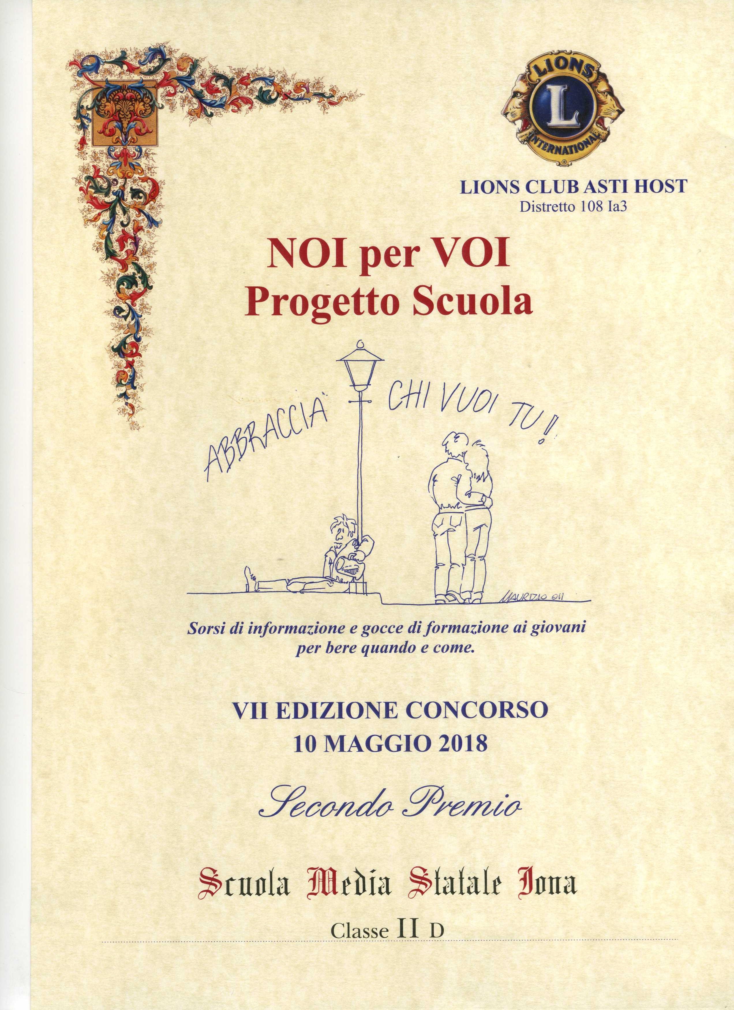Nei mesi scorsi le classi seconde della scuola media Jona hanno partecipato al progetto “Noi per Voi – Progetto Scuola” promosso dal Lions Club di Asti per formare ed educare i ragazzi sui rischi ,spesso sottovalutati, dell’uso e dell’abuso di alcool.